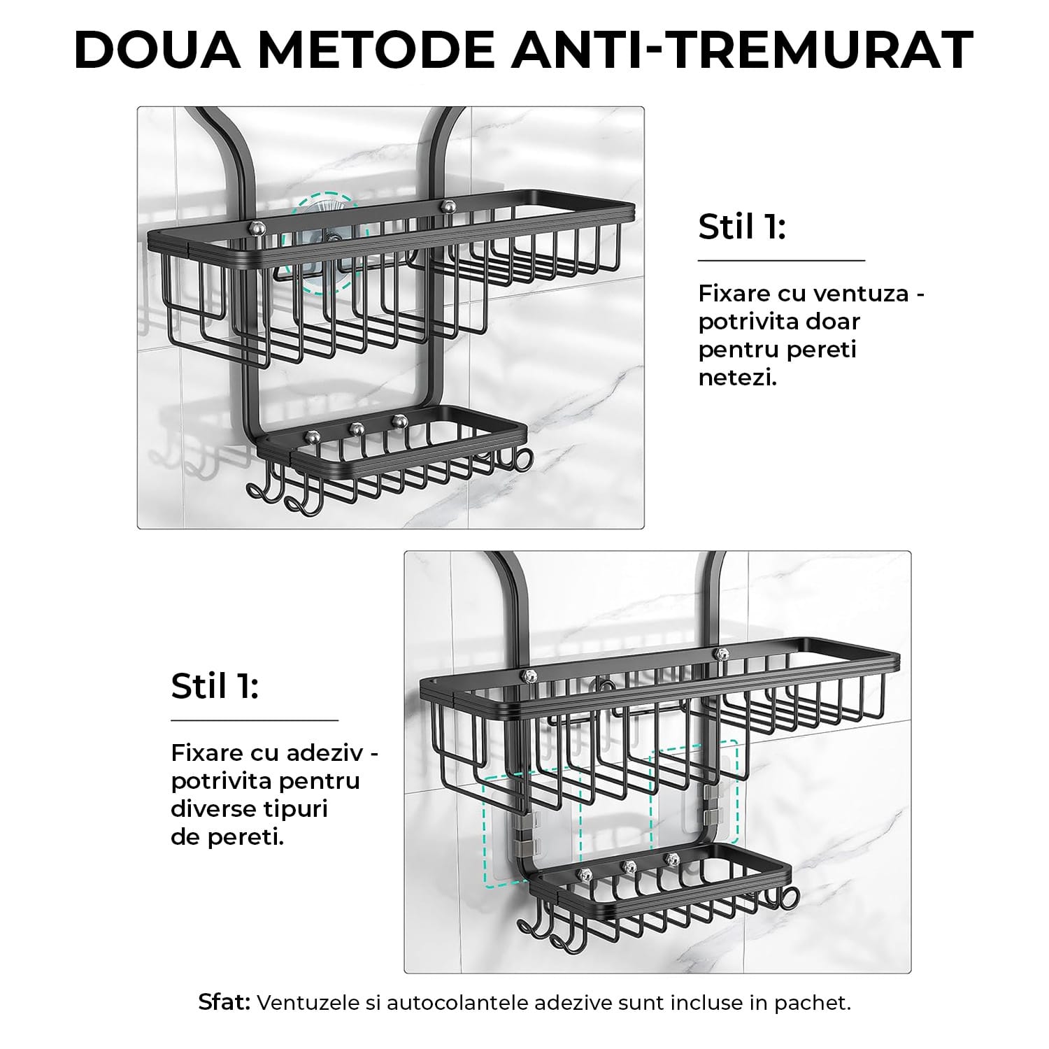 Datorita cercului din cauciuc anti-alunecare de pe partea superioara si accesoriilor de fixare pe perete (1 ventuza si 2 adezive), organizatorul ramane ferm in pozitie, chiar si atunci cand este complet incarcat. Cele doua metode de fixare ofera versatilitate, permitand utilizarea pe diferite tipuri de pereti, in functie de preferintele tale.