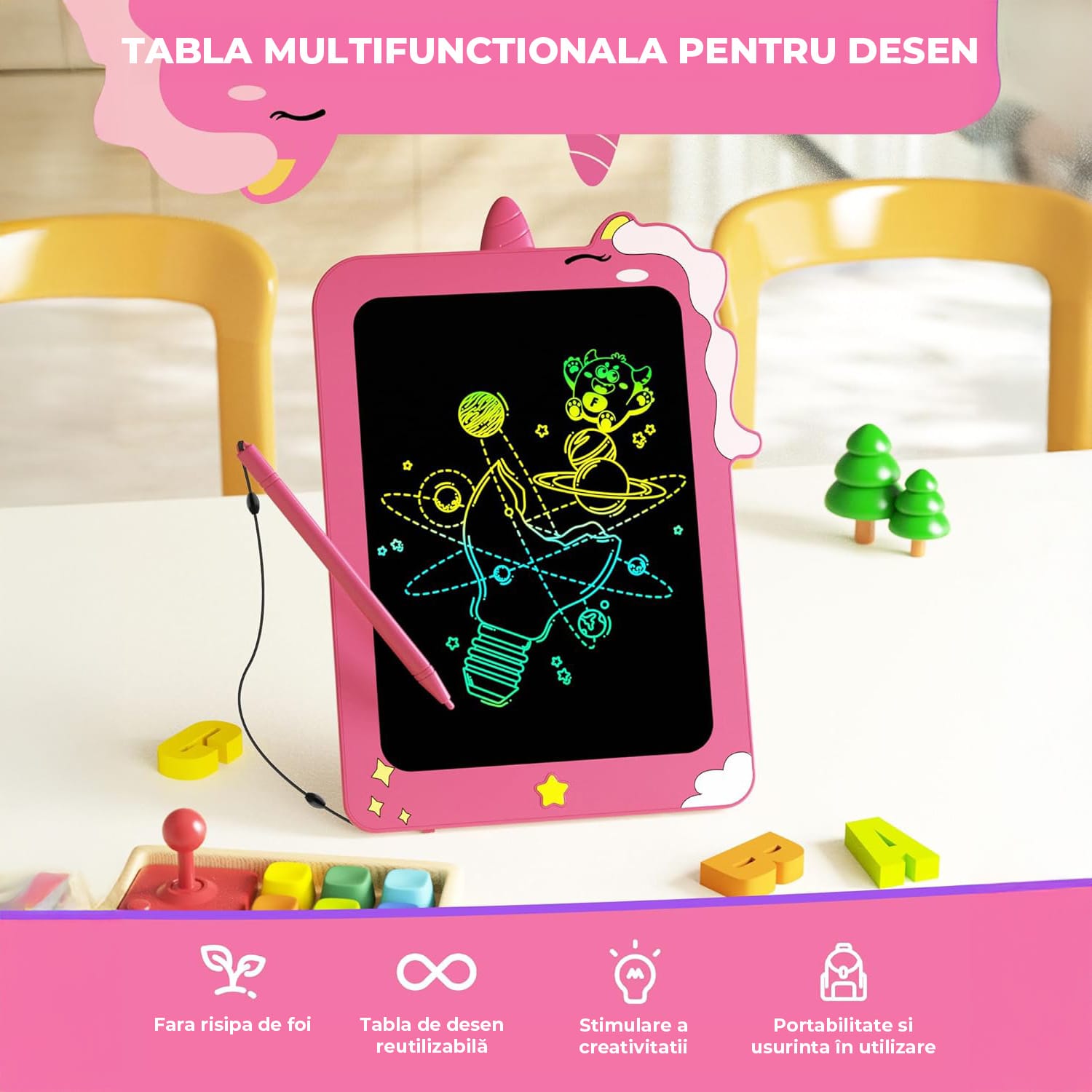 Uită de petele de vopsea și de risipa hârtiei! Tableta oferă o experiență curată, perfectă pentru desen și scris, fără a mai fi nevoie de creioane colorate sau caiete. Este recomandată utilizarea în lumină pentru un contrast mai bun al liniilor.