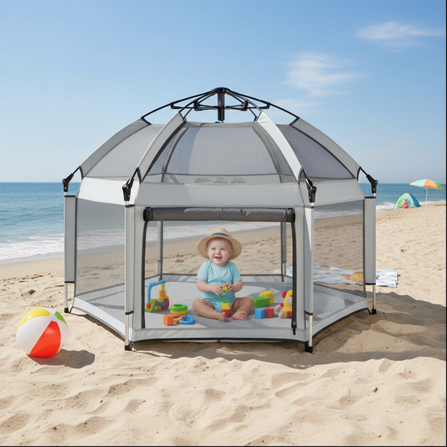 Tarc de Joaca pentru Bebelusi si Copii Elindor® Tip Cort, Spatiul Sigur de Joaca, Plasa de Protectie UV, Include Usa cu Fermoar, Materiale Eco-Friendly și Non-Toxice, Varsta 1-5 ani, 150 x 150 x 122 cm, Gri