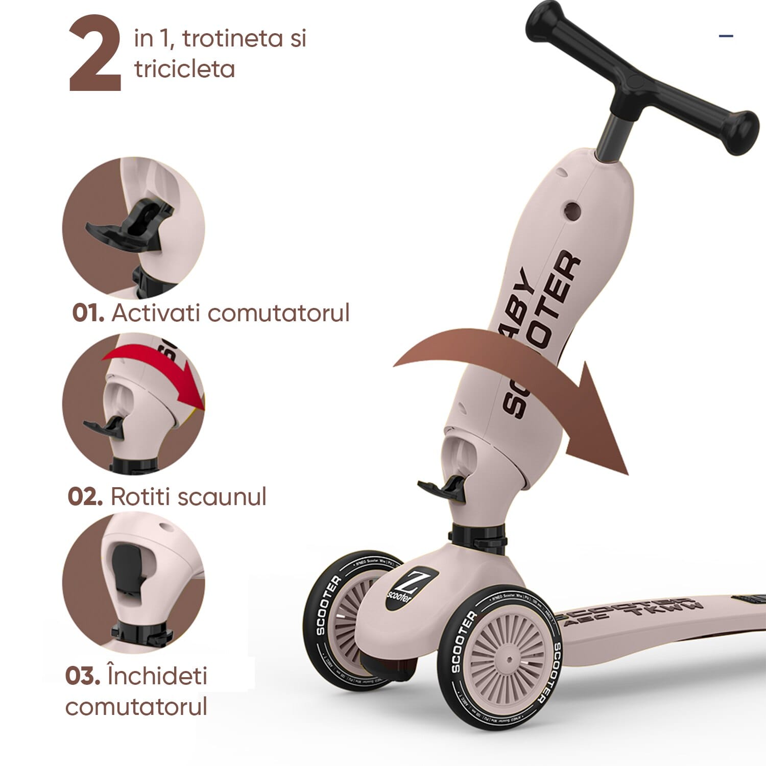 2-IN-1 DISTRACTIE CU TROTINETA: Trotineta noastră este versatilă, putând fi utilizată cu un scaun, asemănătoare unei triciclete, sau pur și simplu ca o trotinetă tradițională.