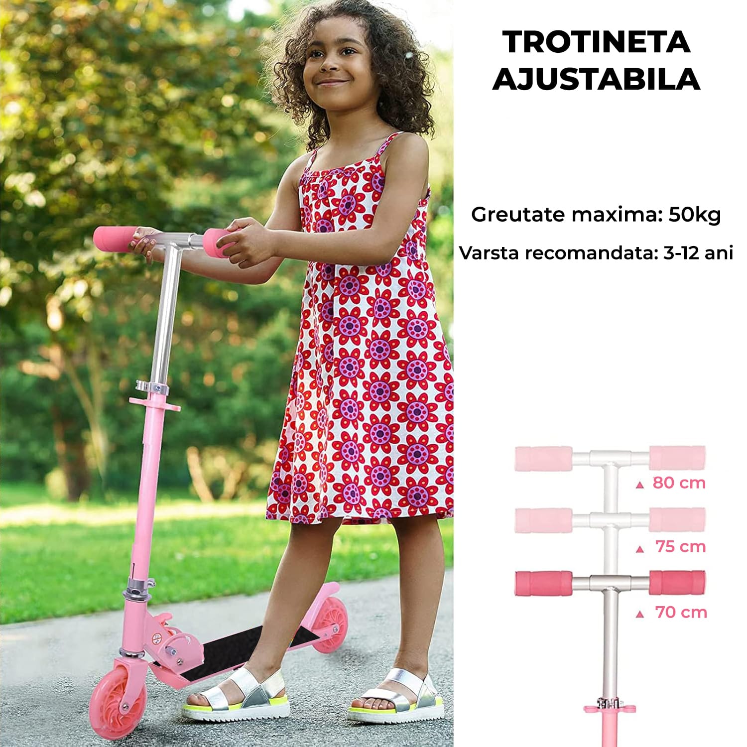 • Ghidon reglabil pe înălțime: Trotineta crește împreună cu copilul tău! Reglabilă în 3 poziții (70 cm, 75 cm și 80 cm), oferă o potrivire perfectă pentru copii între 3 și 12 ani, susținând până la 50 kg.