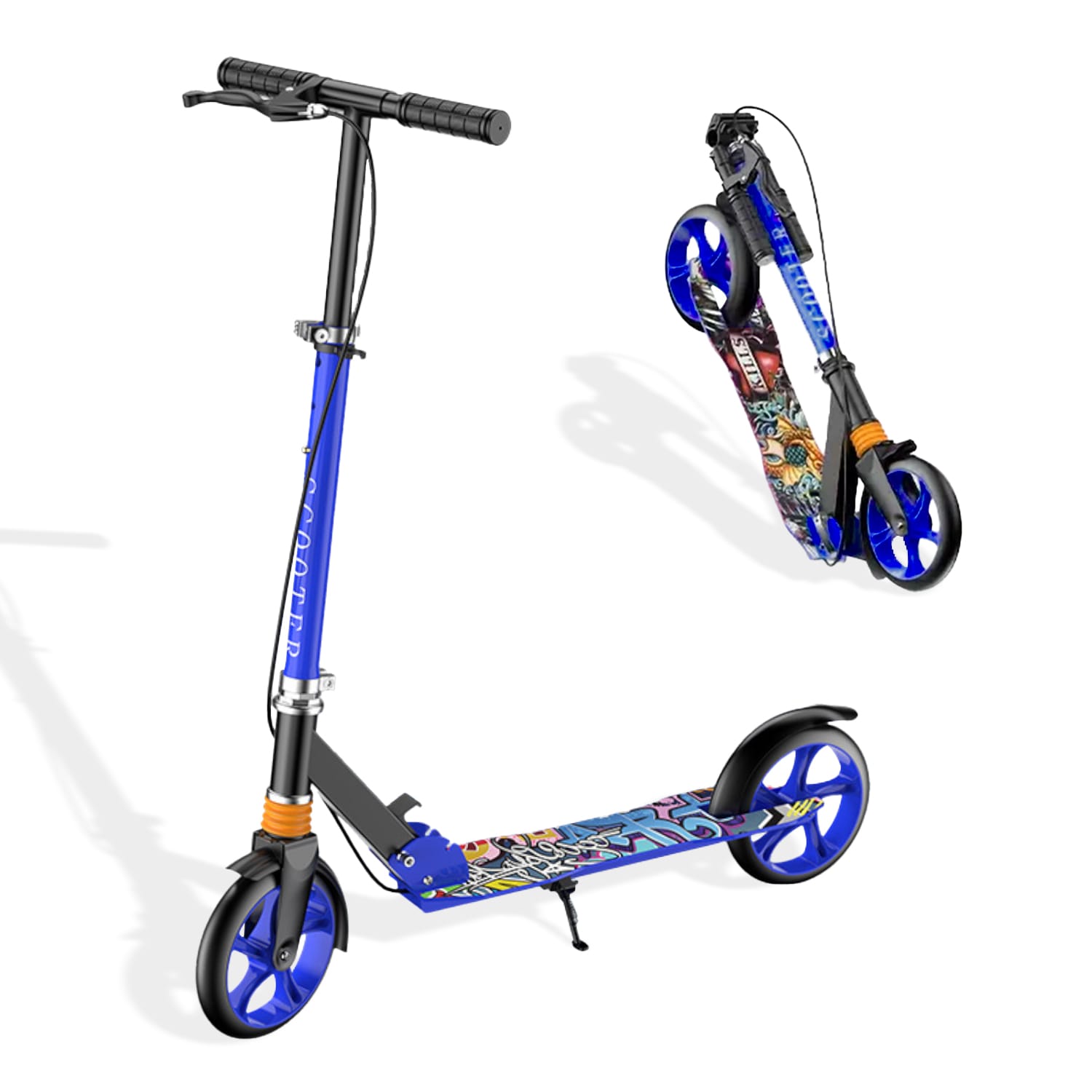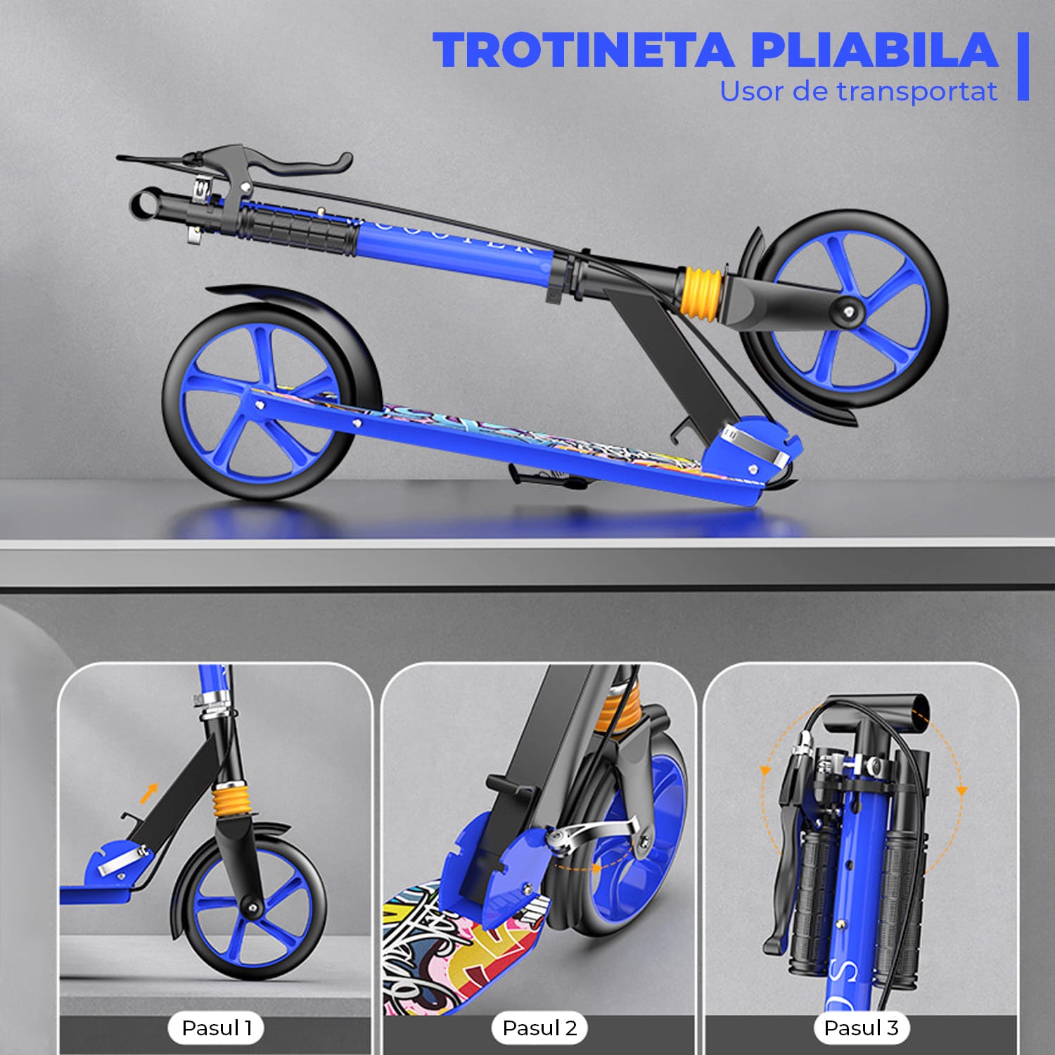 Trotinetă Pliabilă cu Amortizor Elindor®, Frână Spate și Platformă Antiderapantă, Albastră