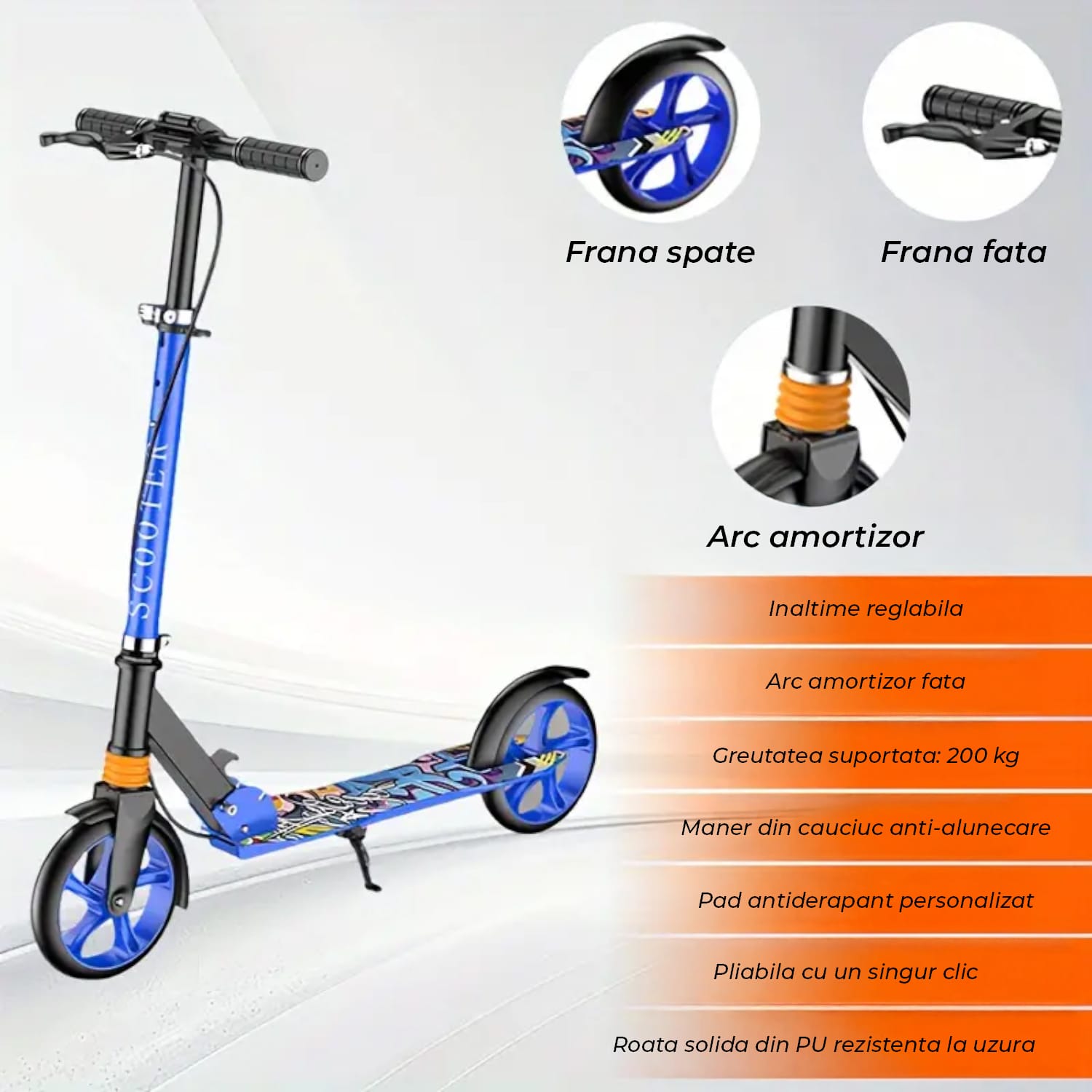 Perfecta pentru plimbarile in oras sau aventurile zilnice, trotineta pliabila Elindor combina functionalitatea cu un design modern. Cu roti mari de 200 mm si un arc amortizor integrat, fiecare plimbare devine lina, stabila si sigura, indiferent de suprafata.