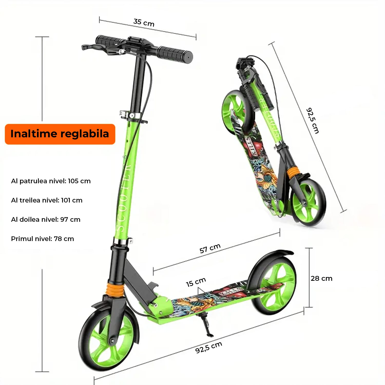• Ghidon Reglabil: Se ajusteaza usor intre 78-105 cm, oferind confort pentru toate varstele, de la copii pana la adulti.