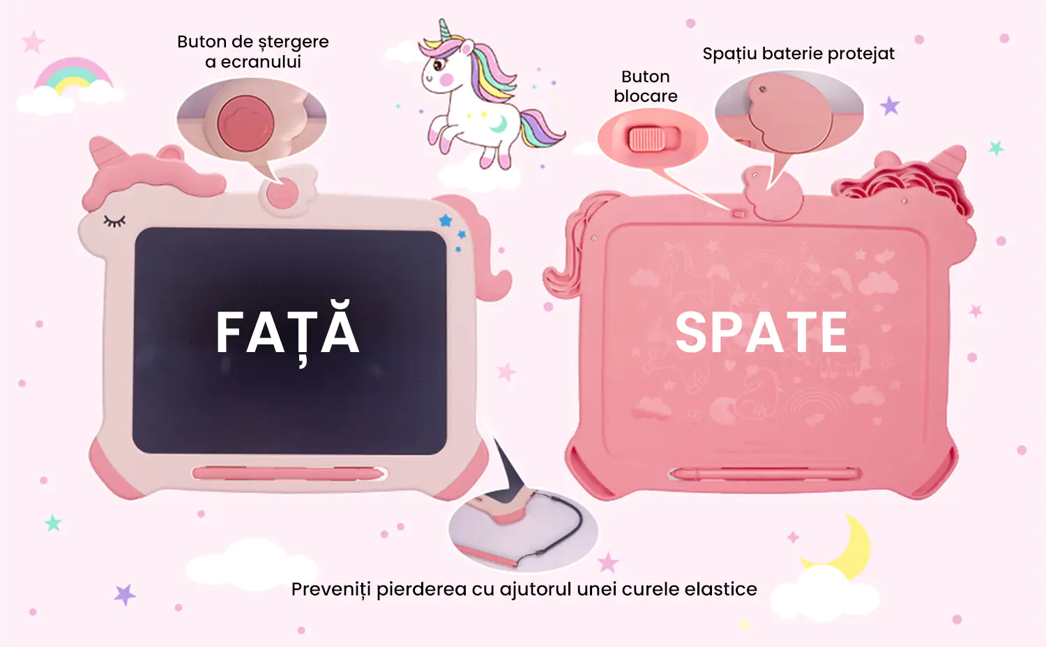 Usor de Utilizat: Tableta noastra de desen este ca o bucata de hartie care nu se termina niciodata! Apasati pur si simplu butonul de pe aripa unicornului, iar tabla de desen se va sterge miraculos! Exista si un comutator inteligent de blocare pe partea din spate care asigura ca creatiile copiilor dvs. nu pot fi sterse accidental. Copiii pot desena linii de diferite grosimi ajustand intensitatea schitei.