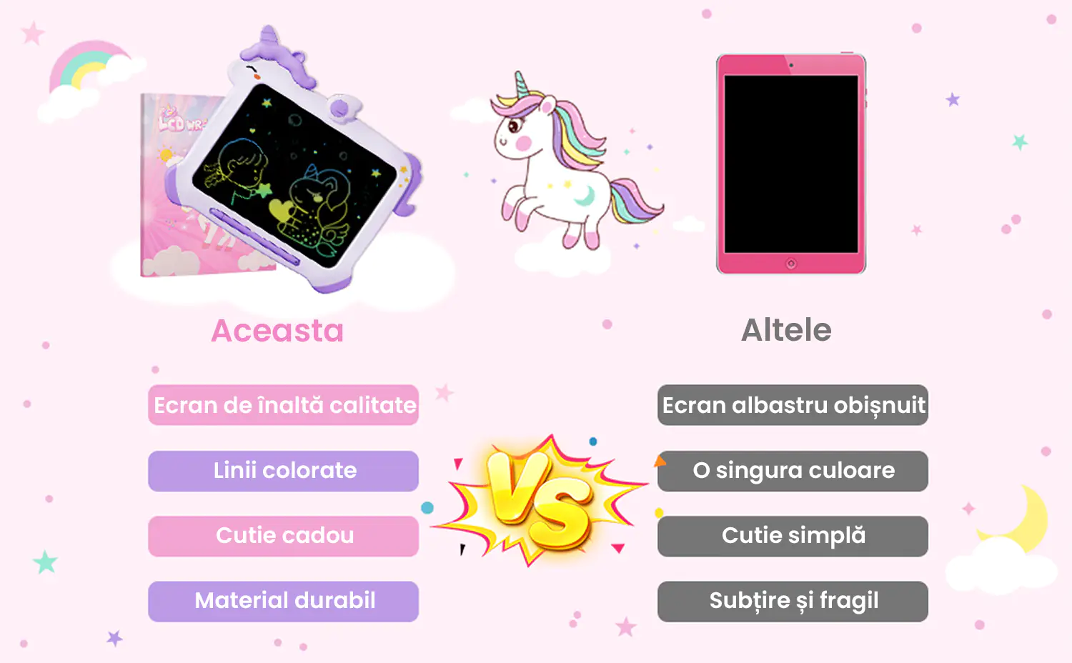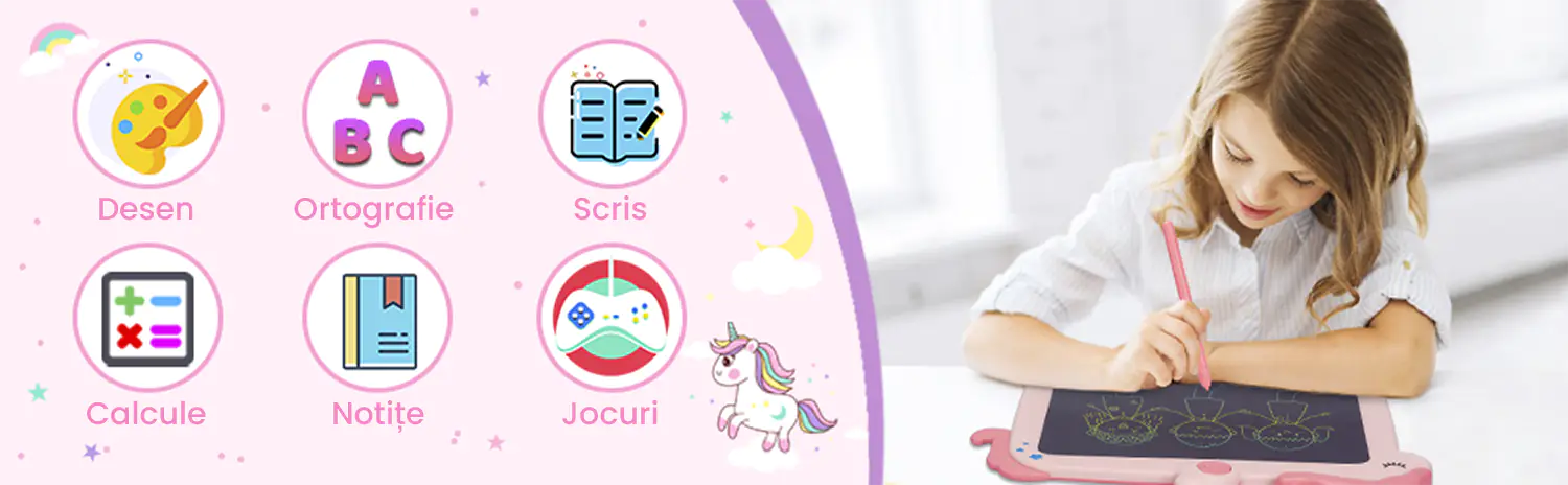 Jucarie Educationala pentru Copii: Tableta de scriere LCD este o jucarie perfecta pentru invatare pentru copiii de 3 pana la 8 ani. Ajuta copiii sa-si elibereze imaginatia si creativitatea. Tabla noastra de desen cu unicorn este o jucarie ideala. Copiii care iubesc sa deseneze sau sa scrie vor fi fericiti sa primeasca acest cadou, o jucarie esentiala ca instrument de invatare prescolara.